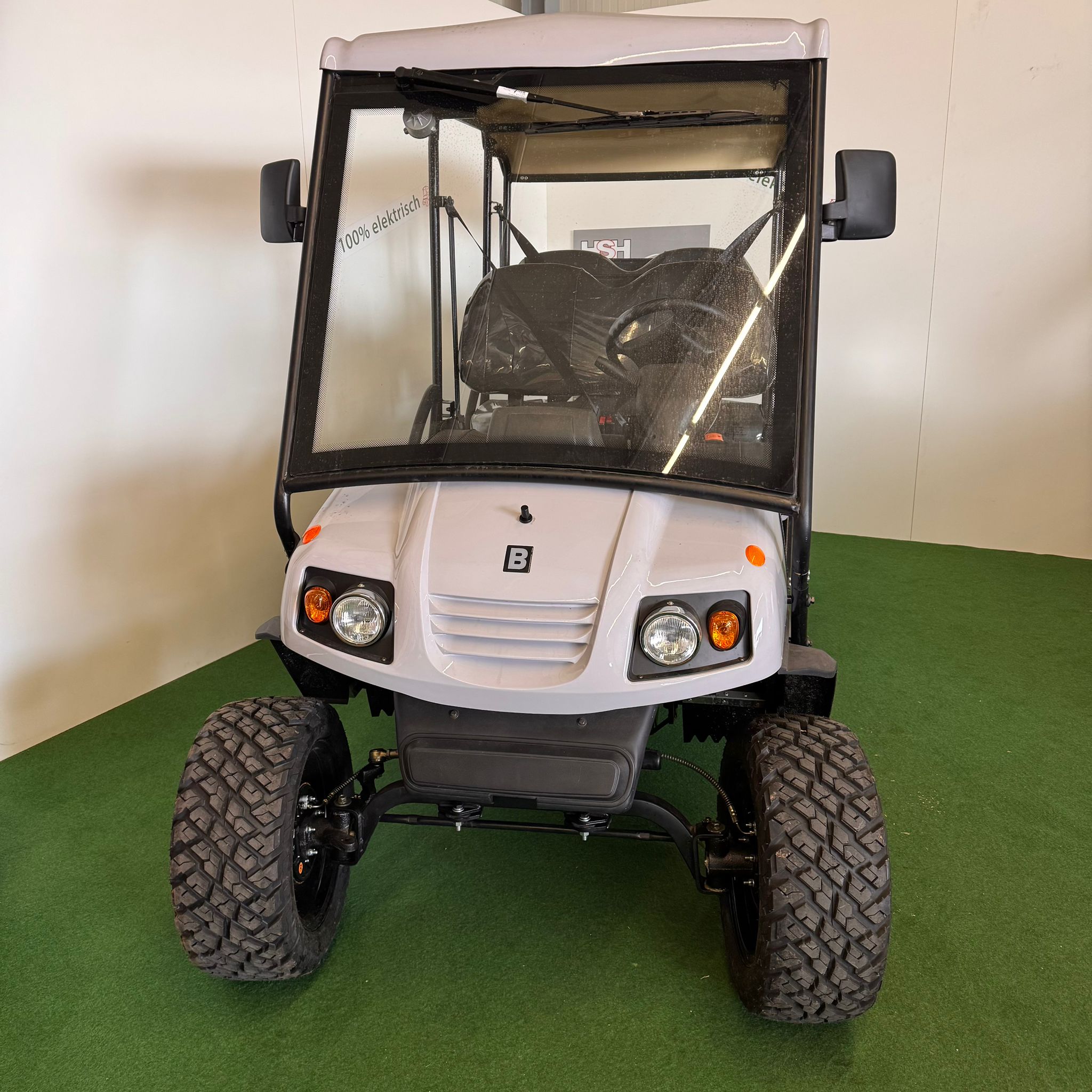 Sofort verfügbar, Farbe hellgrau, 110Ah Lithium Akku, Lagegerät eingebaut, feste Frontscheibe mit Wischer, 10 Zoll Alufelgen, COC Papiere für L7e Zulassung, ca. 40 km/h und ca. 50km Reichweite, Außenspiegel.