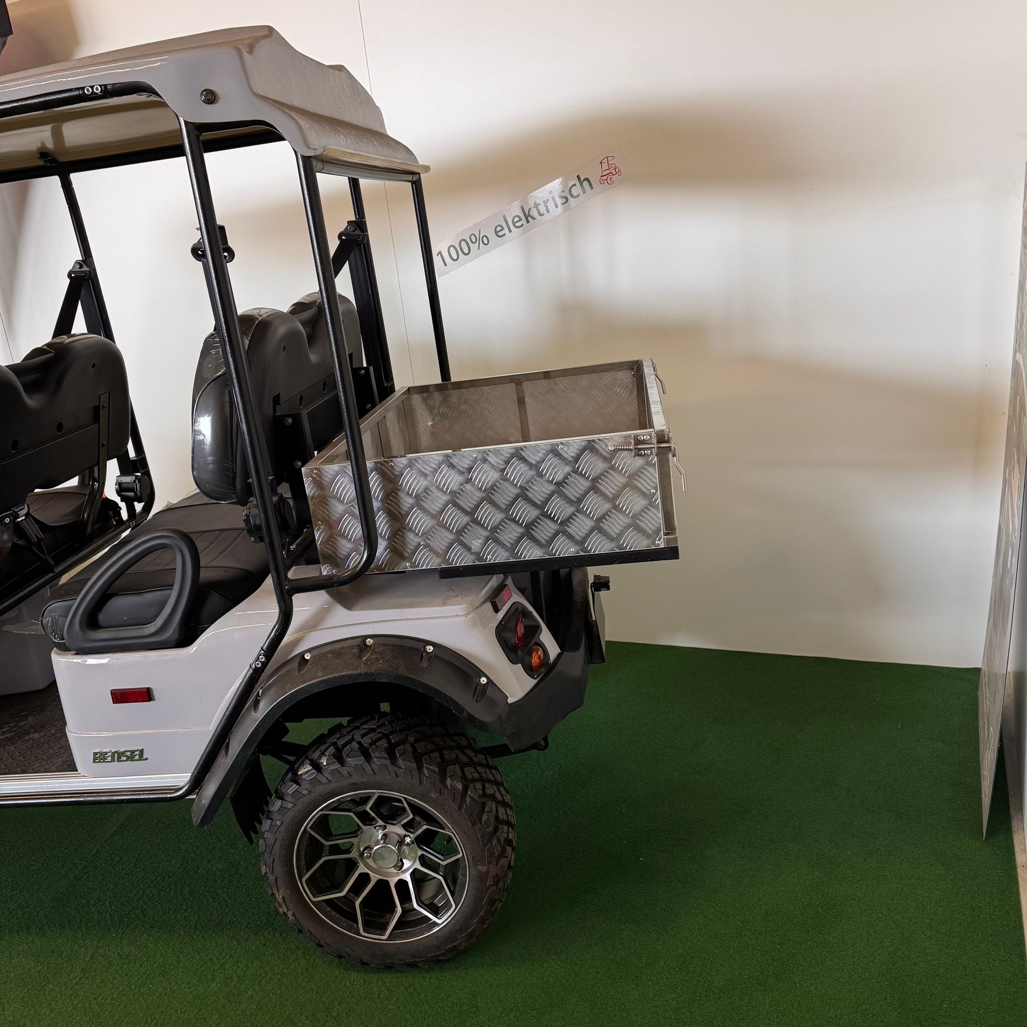 Sofort verfügbar, Farbe grün metallic, 135AH Lithium Akku, Ladegerät eingebaut, 10 Zoll Alufelgen, Alu Ladefläche 1400x 1100x 260mm kippbar, Pemium Sitzbank in beige, Aussenspiegel, LED Lichtanlage, weite Um-uund Anbauten auf Anfrage möglich, Alu Chassis.