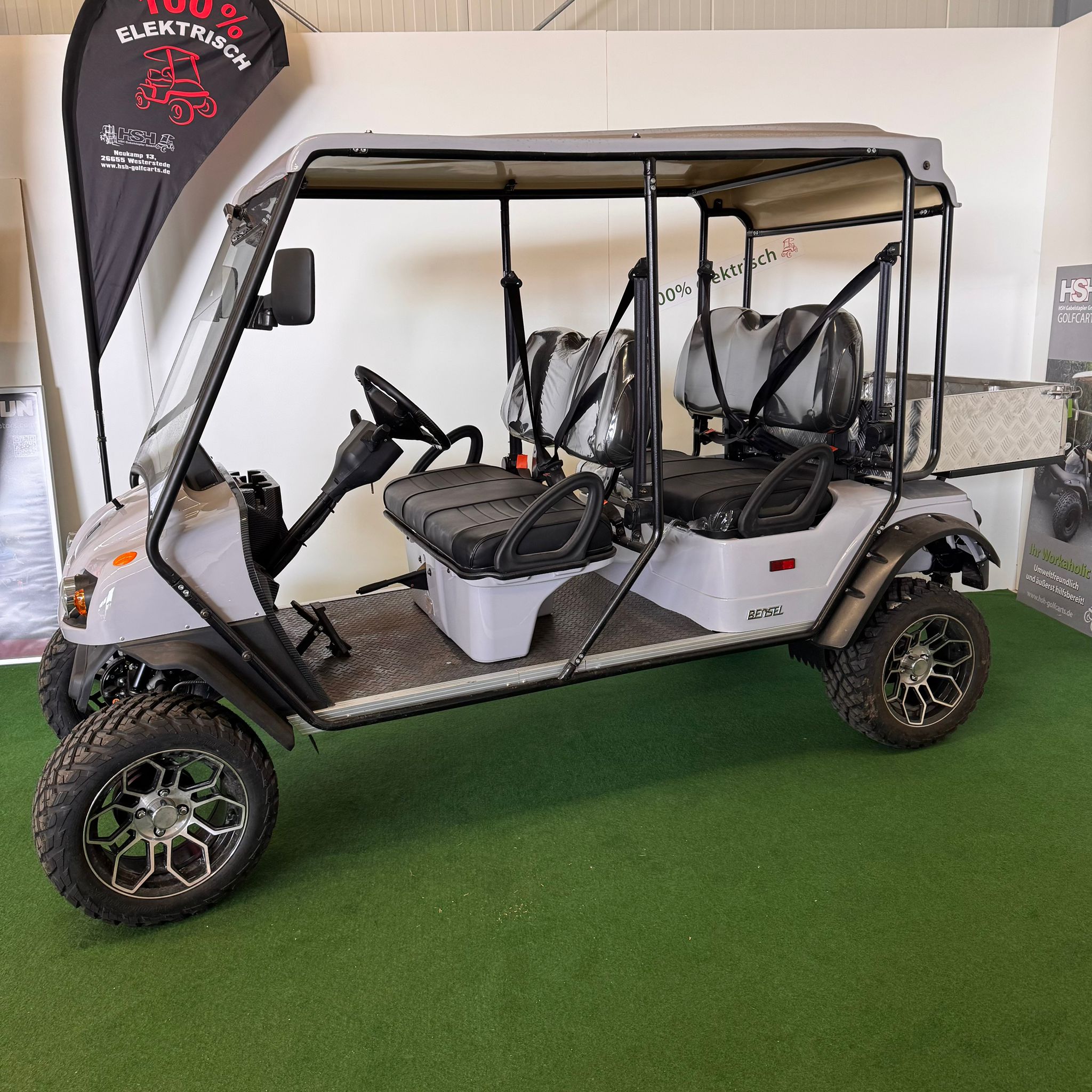 Sofort verfügbar, Farbe schwarz, 105AH Lithium Akku, Ladegerät eingebaut, hintere Sitzbank zur Ladefläche klappbar, LED Beleuchungsanlage, klappbare Frontscheibe, Aussenspiegel, 10 Zoll Alufelgen, Induktive Ladeschale für Ihr Handy, Frontbügel, Ablagekorb vorne, vorne und hinten Hydr. Bremsen, 4KW Motor, weitere Optione auf Anfrage.